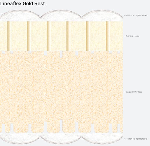 Современный удобный и очень легкий матрас Gold rest пользуется необыкновенной популярностью у российских покупателей. И неудивительно! Ведь, он способен следить не только за крепким сном своих хозяев, но и обеспечивать анатомическую поддержку во время отдыха. Основа из латексной пены создает наилучший ортопедический эффект, а нижний недеформируемый слой ERGOFLEX-Formax с семизональной поддержкой обеспечивает потрясающий воздухообмен, поддерживая идеальный баланс температуры и влажности спального места.