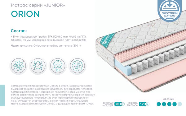Самая жесткая и износостойкая модель в серии. Такой матрас легко выдержит вес ребенка и при необходимости вес взрослого человека. Комбинация бикоттона и массажной пены плотностью 25 кг/м позволяет эффективно распределять весовую нагрузку, сохраняя высокие эксплуатационные показатели. За счет «трехмерной» поверхности пены улучшается воздухообмен, а с ним гигиеничность спального места. Матрас комплектуется мягким и дышащим трикотажем «Ovis».