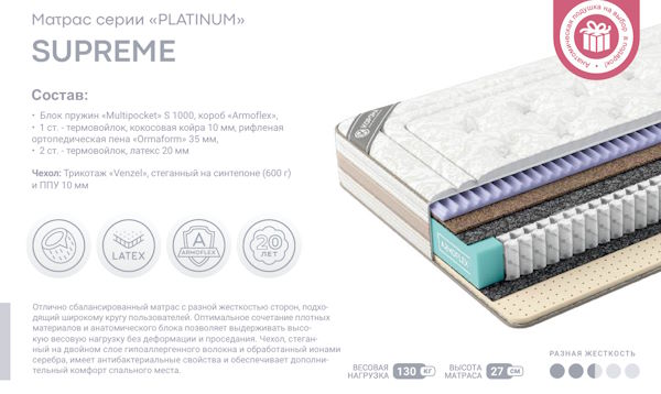 Отлично сбалансированный матрас с разной жесткостью сторон, подходящий широкому кругу пользователей. Оптимальное сочетание плотных материалов и анатомического блока позволяет выдерживать высокую весовую нагрузку без деформации и проседания. Чехол, стеганный на двойном слое гипоаллергенного волокна и обработанный ионами серебра, имеет антибактериальные свойства и обеспечивает дополнительный комфорт спального места.